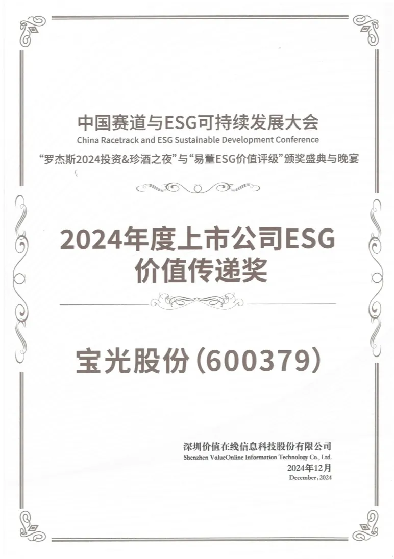 12月8日,易董價值在線ESG價值評級頒獎盛典在深圳舉行,寶光股份憑借在ESG方面的突出表現,堅持透明、負責任的ESG實踐及有效的價值傳遞,榮獲“2024年度上市公司ESG價值傳遞獎”。該獎項的獲得是對寶光股份在ESG信息披露、投資者關系管理和市場溝通等方面的認可。