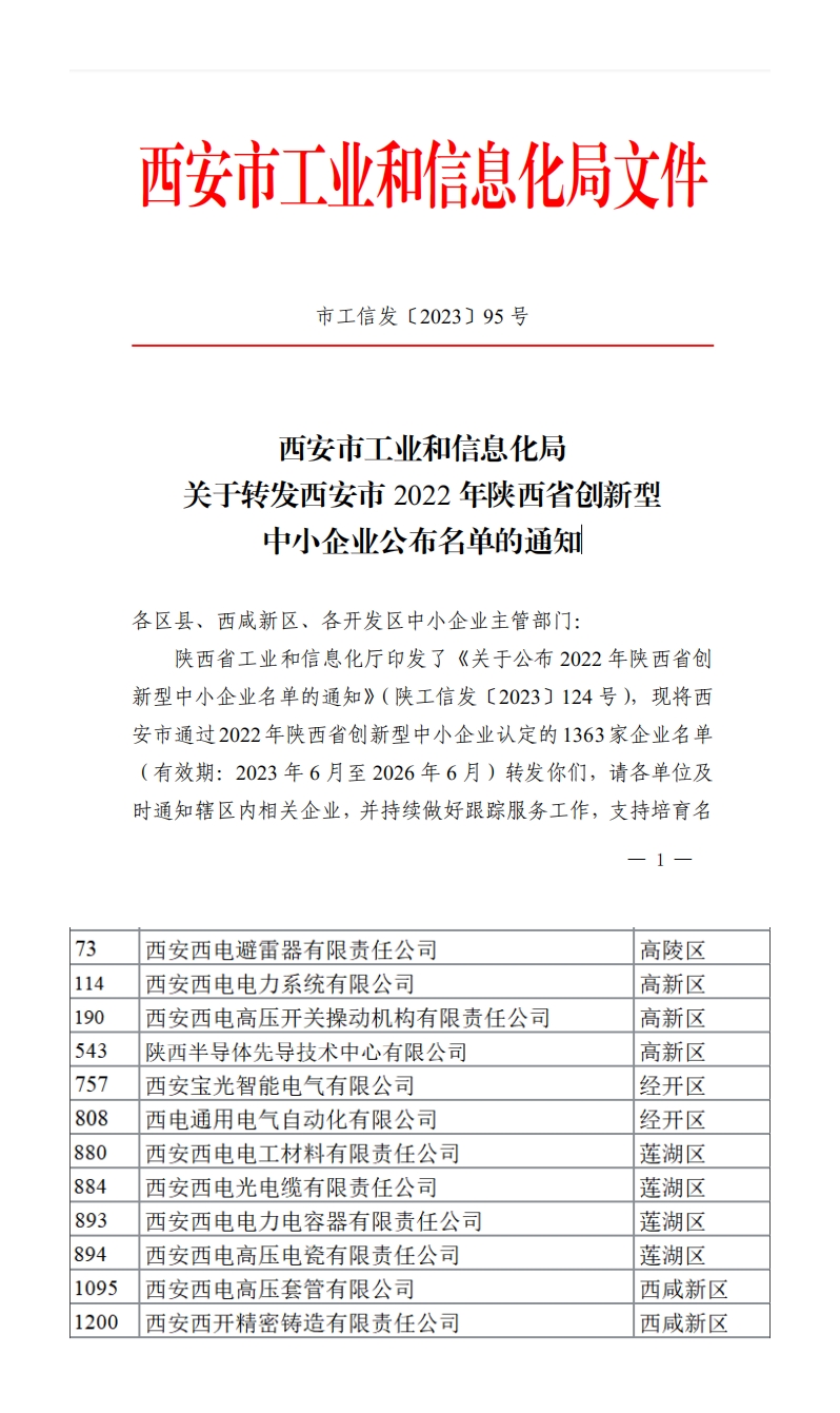 日前,陜西省工信廳印發(fā)《關(guān)于公布2022年陜西省創(chuàng)新型中小企業(yè)名單的通知》,文件公布了《西安市2022年陜西省創(chuàng)新型中小企業(yè)名單》,公司所屬西電電力系統(tǒng)、西電套管、西電西容、西電西材、西電光電纜、西電避雷器、西電西瓷、西電操動(dòng)機(jī)構(gòu)、西電通用、西開(kāi)鑄造、寶光智能、先導(dǎo)中心成功入選,被認(rèn)定為2022年陜西省創(chuàng)新型中小企業(yè)。